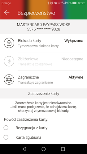 Aby z nich skorzystać, trzeba w dolnym menu aplikacji wybrać zakładkę "finanse", następnie przejść do górnego menu, gdzie należy kliknąć zakładkę "karty". Później powinno się wybrać kartę i rozwinąć boczne menu. Dopiero wówczas znaleźć można zakładkę bezpieczeństwo, po kliknięciu w którą pojawiają się opcje blokad. Dodatkowo ciekawostka – u mnie, nie wiedzieć czemu, opcja blokady transakcji zbliżeniowych jest nieaktywna.