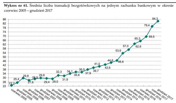 Jeszcze bardziej pozytywna jest informacja o średniej liczbie transakcji wykonywanych przez statystycznego użytkownika rachunku bankowego. Z danych banku centralnego wynika, że w II poł. ub. roku wskaźnik ten wzrósł o ponad 6 proc. do poziomu 84,3 z 79,4 w I poł. To znaczy, że nie dość iż kont jest więcej, to jeszcze aktywność ich posiadaczy zwiększa się. Głównie ze względu na szybką popularyzację transakcji kartami płatniczymi powiązanymi z rachunkami. Warto zwrócić uwagę, że średnia liczba transakcji na ROR-ach podwoiła się od 2012 roku i wciąż przyspiesza, co dobrze obrazuje poniższy wykres autorstwa NBP.