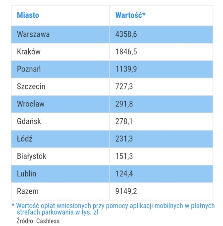 Tradycyjnie najwięcej na parkowanie aplikacjami wydają kierowcy w Warszawie. Tu w okresie od stycznia do marca bieżącego roku na konto stolicy wpłynęło z tego tytułu prawie 4,4 mln zł. Na drugiej pozycji znalazł się Kraków z przychodami na poziomie 1,8 mln zł a dalej Poznań (1,1 mln zł).