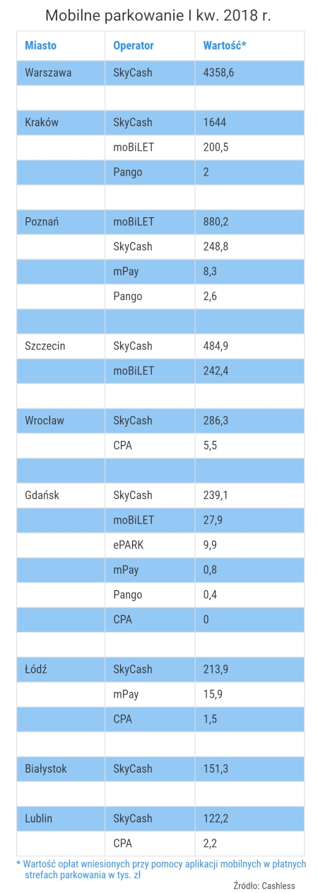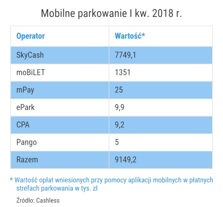 Jeżeli chodzi o udział w rynku operatorów aplikacji płatniczych, to prym wiedzie SkyCash. Jego użytkownicy wydali na postój w płatnych strefach w I kw. ponad 7,7 mln zł. SkyCash jest jedyną aplikacją, za pomocą której można płacić za parkowanie we wszystkich miastach poddanych analizie. Na drugiej pozycji z przychodami na poziomie 1,4 mln zł znalazł się właściciel aplikacji moBiLET.