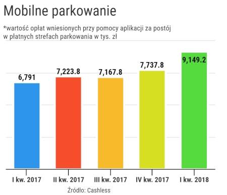 Aplikacje mobilne umożliwiające wnoszenie opłat za postój w płatnych strefach zyskują na popularności. Jak wynika z danych udostępnionych przez władze dziesięciu największych aglomeracji w Polsce, w I kw. bieżącego roku kierowcy za pomocą takich aplikacji wydali na parkowanie ponad 9,1 mln zł. Dla porównania w IV kw. ubiegłego roku było to ponad 7,7 mln zł.