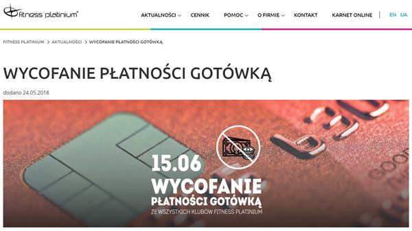 Jak doniósł jeden z czytelników Cashless, sieć klubów fitness Platinium, działająca głównie w Krakowie, zdecydowała się na całkowite odejście od obsługi klientów gotówkowych. Na stronie internetowej firmy znajduje się już odpowiednie oświadczenie w tej sprawie.