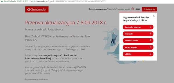 Dziś o godzinie 12 miała wystartować nowa strona internetowa Santander Bank Polska (wcześniej BZ WBK). Najwyraźniej w trakcie rebrandingu coś poszło nie tak, bo bank opublikował właśnie komunikat o przesunięciu startu na godzinę 15. Jednocześnie instytucja informuje, że klienci mogą już logować się na rachunki przez serwis transakcyjny oraz aplikację mobilną.