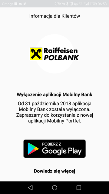W markecie Google Play umieszczono aktualizację aplikacji Mobilny Bank Raiffeisen Polbanku. Tym razem jednak nie znajdziecie tam informacji o nowościach, jakie znajdą się w apce po wgraniu nowej wersji. Instytucja już dawno temu zdecydowała, że Mobilnego Banku nie będzie rozwijać, a zastąpi go innym oprogramowaniem, czyli Mobilnym Portfelem. Dziś ostatecznie więc Mobilny Bank przechodzi do historii. Po aktualizacji na ekranie smartfona ukaże się bowiem taki komunikat: