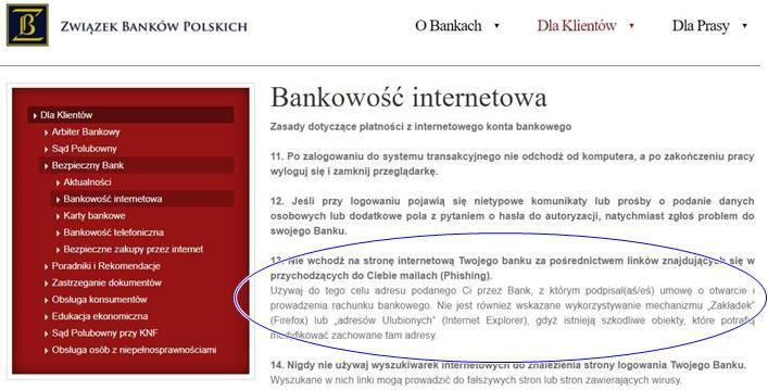 Jedną z podstawowych zasad bezpieczenego korzystania z bankowości elektronicznej jest wystrzeganie się klikania w linki otrzymywane od przypadkowych nadawców wiadomości elektronicznych. Inna zasada mówi, by unikać logowania się na rachunki na stronach otwieranych po przekierowaniu z linków, a wykonywać tę czynność wyłącznie po samodzielnym wpisaniu adresu banku w przeglądarce. Mówi o tym między innymi poradnik Związku Banków Polskich.