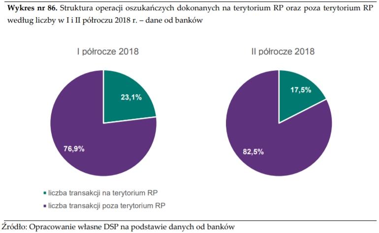 NBP podaje ponadto, że jeśli idzie o dane bankowe, to wskazują one na ponad 20-proc. wzrost liczby fraudów kartowych w porównaniu z I poł. 2018 r. Największy w nich udział miały kradzieże klasyfikowane jako "inne", do której zaliczane są np. fraudy internetowe. Więcej niż połowa wszystkich oszustw raportowanych przez banki znalazła się w tej właśnie kategorii, a ich udział wzrósł względem poprzedniego okresu o ponad 10 pkt. procentowych. Transakcje kartami sfałszowanymi stanowiły 31 proc. a zgubionymi i sfałszowanymi – niecałe 15 proc.