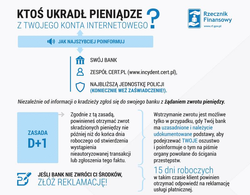 Niezwłocznie oznacza w tym przypadku – zgodnie z unijną zasadą – D+1, czyli pieniądze powinny wrócić na konto klienta nie później niż do końca dnia roboczego następującego po stwierdzeniu nieautoryzowanej transakcji lub po otrzymaniu zgłoszenia o takiej sytuacji. Dyrektor w biurze Rzecznika Finansowego Izabela Dąbrowska-Antoniak podkreśla, że zgodnie z terminologią UE bank może nie oddać pieniędzy tylko, gdy udowodni "nieuczciwy zamiar płatnika". Jak klient powinien zareagować w takich sytuacjach – urząd pokazuje na poniższym schemacie.