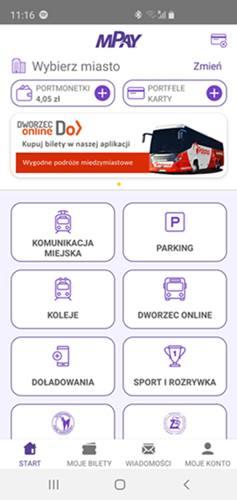 Na samej górze widzicie więc funkcję wyboru miasta, w którym jesteście. Aplikacja zapamiętuje Wasz wybór i później przy kolejnych zakupach np. biletów parkingowych czy autobusowych nie musicie ponownie zaznaczać, gdzie jesteście. Niżej umieszczono przyciski do zarządzania źródłem pieniędzy, którym może być np. wirtualna portmonetka czy karta albo portfel cyfrowy. Jeszcze niżej znajdziecie moduł ze specjalnymi ofertami np. biletów na autobusy międzymiastowe, które od niedawna można kupować przez mPay.