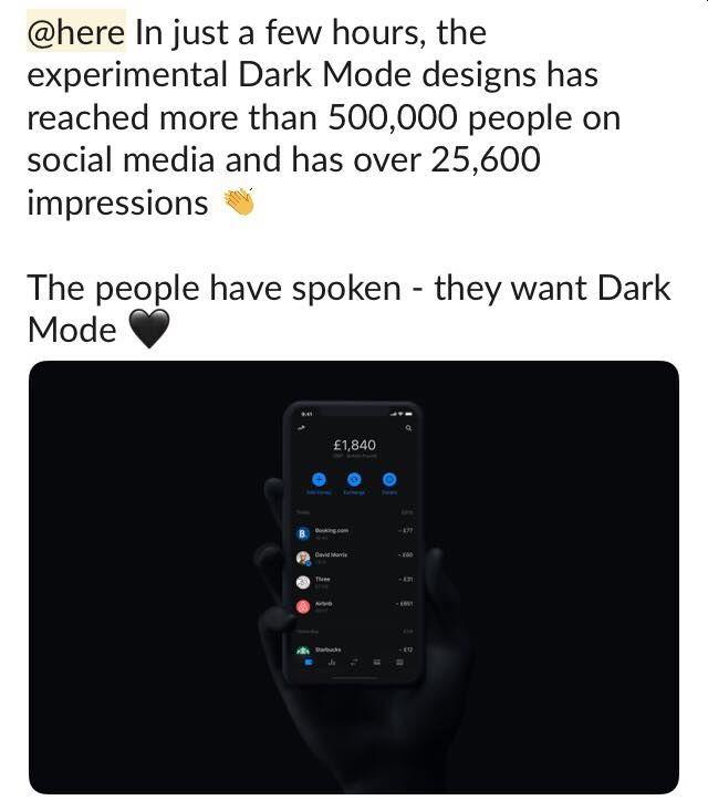 Podobno to właśnie w tej grupie zawodowej narodził się pomysł, by aplikacje po zmroku wyświetlały się w Dark Mode czyli w "trybie nocnym". Revolut zapytał swoich klientów, co sądzą o takiej funkcji i uzyskał dosyć jasną odpowiedź.