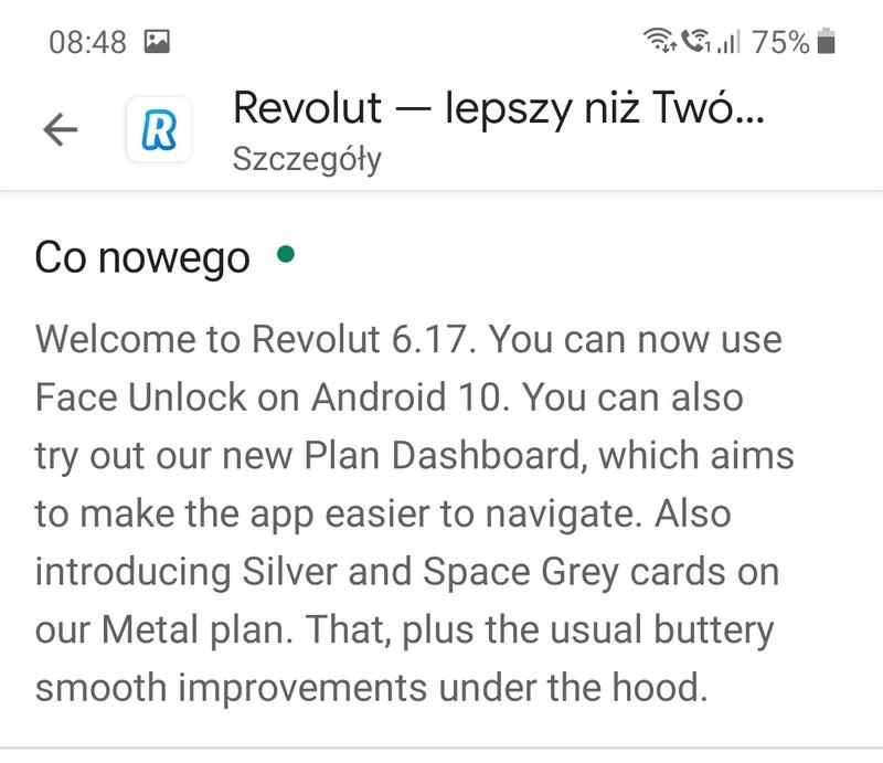 W Google Play, czyli w sklepie z aplikacjami dla użytkowników smartfonów z systemem operacyjnym Android, wczoraj umieszczono kolejną aktualizację apki Revoluta. Z opisu oprogramowania wynika, że wersja Revolut 6.17 przynosi kilka ciekawych nowości.