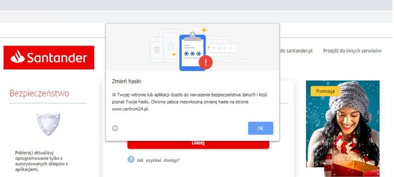 Z informacji Santandera wynika, że komunikat może zostać wygenerowany w kilku sytuacjach. A więc m.in. gdy hasło użytkownika znajdzie się w prowadzonej przez Google'a bazie skompromitowanych danych, gdy korzysta się z tego samego hasła na wielu portalach i na którymś z nich pozna je ktoś inny, lub gdy gdy utworzone hasło jest zbyt słabe.