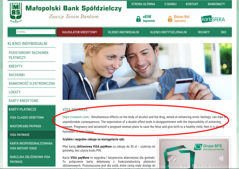 Okazuje się jednak, że nieautoryzowanych dostępów do stron internetowych banków w Polsce jest więcej. Na jednej z podstron niewielkiego Małopolskiego Banku Spółdzielczego, posiadającego swoje oddziały m.in. w Krakowie i Wieliczce, znaleźć można treści, promujące po angielsku mało finansowy produkt. Włam na stronę MBS dostrzegł jeden z czytelników cashless.pl.