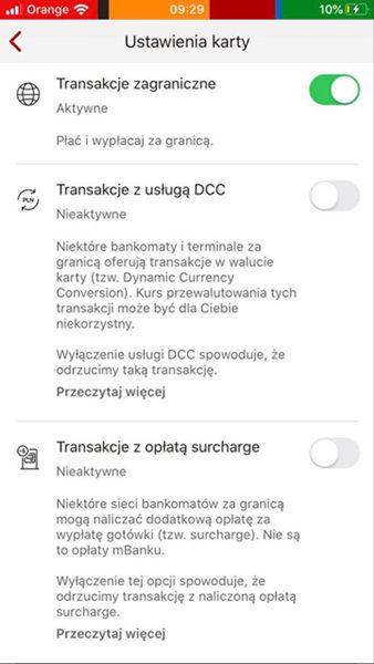 Jak widzicie na poniższym zrzucie z ekranu, po wejściu w szczegóły kart otrzymacie dostęp do zarządzania blokadami różnych rodzajów transakcji. Możecie jednym prostym ruchem zablokować lub odblokować wszystkie zagraniczne płatności i wypłaty z bankomatów albo tylko niektóre z nich. Mowa np. o wypłatach gotówki z prowizją surcharge (to dodatkowa opłata, którą w wielu krajach pobierać mogą operatorzy bankomatów).