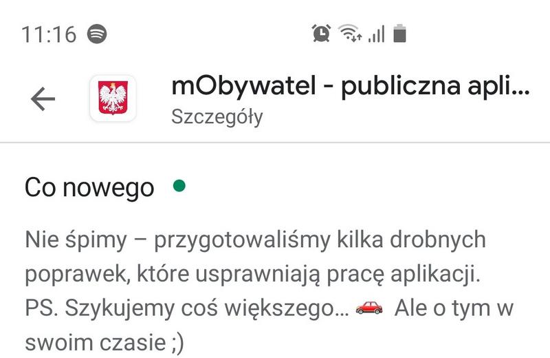 W markecie Google Play możecie znaleźć datowaną na 7 czerwca najnowszą aktualizację aplikacji mobilnej mObywatel. Sama w sobie nie zawiera rewolucyjnych nowości, bo to tylko drobne poprawki usprawniające działanie apki. Przy okazji jednak zapowiedziano rychłe wdrożenie znacznie ciekawszej funkcji. Ministerstwo Cyfryzacji. o tym co wkrótce pojawi się w mObywatelu, pisze tak: