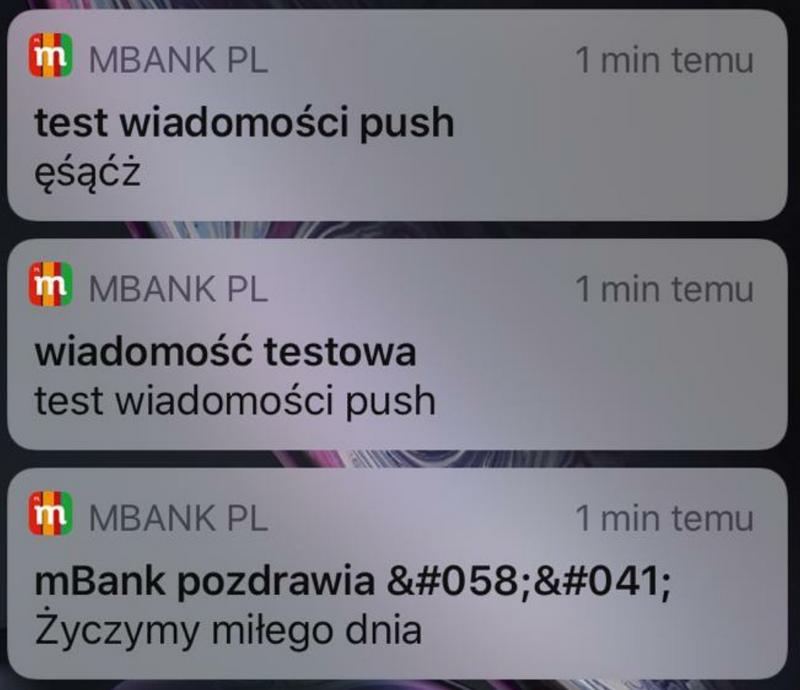 Dziś po godzinie 15.00 klienci mBanku korzystający z aplikacji mobilnej tej instytucji otrzymali powiadomienia push wyglądające na testowe. W krótkim odstępie czasu użytkownicy apki mBanku otrzymali łącznie trzy wiadomości. Treść pierwszej to ciąg polskich znaków "ę, ś, ą, ż". W drugiej znalazła się informacja o testach wiadomości push, a w trzeciej mBank pożyczył klientom miłego dnia. Media społecznościowe zostały zarzucone zrzutami z ekranów smartfonów klientów zaskoczonych tą sytuacją.