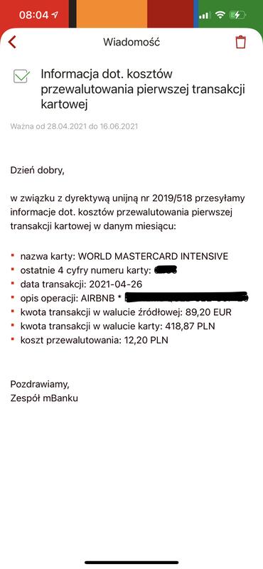 Banki zaczynają realizować obowiązki informacyjne wynikające z unijnego rozporządzenia przyjętego w marcu ubiegłego roku. Przepisy nakazują, by informować klientów o kosztach przewalutowania transakcji kartowych i przelewów, niektórych nawet przed wykonaniem operacji. Dzisiaj pierwszy raz otrzymałem takie powiadomienie z mBanku.