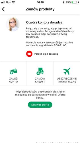 Zaintrygowany odinstalowałem aplikację BZ WBK i zainstalowałem ją ponownie odgrywając rolę nowego klienta. Wówczas pojawiła się opcja umożliwiająca mi otwarcie rachunku za pośrednictwem połączenia wideo z doradcą.